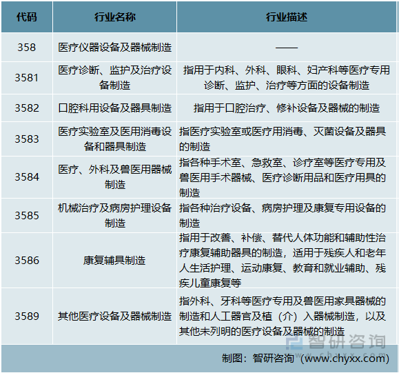 根据国家统计局制定的《国民经济行业分类》(GB/T 4754-2017)2019年修改版,医疗仪器设备及器械制造业国民经济行业类别代码为C358,包括七个子类别: